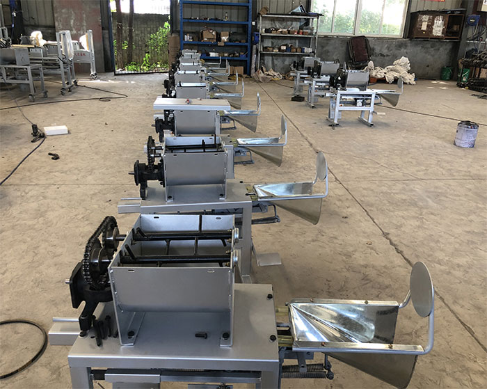 料斗開(kāi)始上料后,打開(kāi)電機(jī)用手將拖斗拉出,用腳踩住踏板后套上菌袋,松開(kāi)腳踏板,